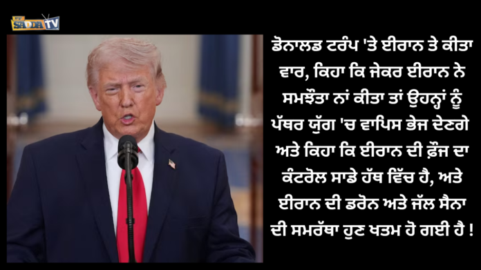 All ਡੋਨਾਲਡ ਟਰੰਪ ‘ਤੇ ਈਰਾਨ ਤੇ ਕੀਤਾ ਵਾਰ ! By saddatvusa - April 2, 2026 0 3 FacebookTwitterPinterestWhatsApp ਡੋਨਾਲਡ ਟਰੰਪ ‘ਤੇ ਈਰਾਨ ਤੇ ਕੀਤਾ ਵਾਰ, ਕਿਹਾ ਕਿ ਜੇਕਰ ਈਰਾਨ ਨੇ ਸਮਝੌਤਾ ਨਾਂ ਕੀਤਾ ਤਾਂ ਉਹਨ੍ਹਾਂ ਨੂੰ ਪੱਥਰ ਯੁੱਗ ‘ਚ ਵਾਪਿਸ ਭੇਜ ਦੇਣਗੇਅਤੇ ਕਿਹਾ ਕਿ ਈਰਾਨ ਦੀ ਫ਼ੌਜ ਦਾ ਕੰਟਰੋਲ ਸਾਡੇ ਹੱਥ ਵਿੱਚ ਹੈ, ਅਤੇ ਈਰਾਨ ਦੀ ਡਰੋਨ ਅਤੇ ਜੱਲ ਸੈਨਾ ਦੀ ਸਮਰੱਥਾ ਹੁਣ ਖਤਮ ਹੋ ਗਈ ਹੈ !
