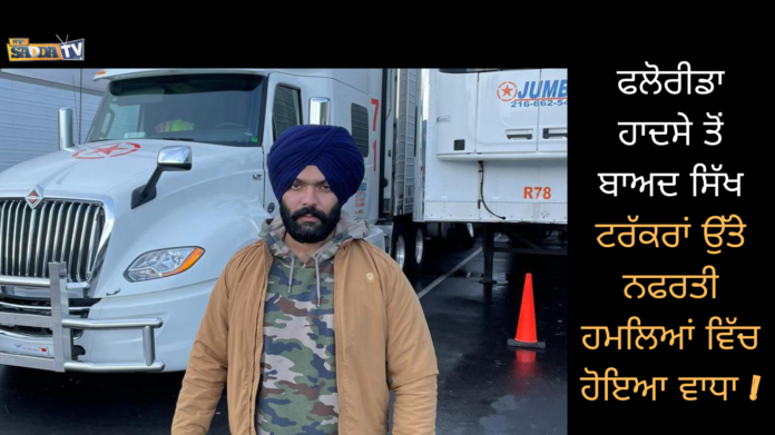 ਫਲੋਰੀਡਾ ਟਰਨਪਾਈਕ ‘ਤੇ ਸਿੱਖ ਡਰਾਈਵਰ ਦੇ ਕਾਰਨ ਹੋਏ ਘਾਤਕ ਹਾਦਸੇ ਤੋਂ ਬਾਅਦ ਅਮਰੀਕਾ ਵਿੱਚ ਹੁਣ ਸਿੱਖ ਟਰੱਕਰਾਂ ਵਿਰੁੱਧ ਨਫ਼ਰਤੀ ਹਮਲਿਆਂ ਦੀ ਘਟਨਾਵਾਂ ਤੇਜ਼ੀ ਨਾਲ ਸਾਹਮਣੇ ਆ ਰਹੀਆਂ ਹਨ। ਇਸ ਹਾਦਸੇ ਵਿੱਚ ਇੱਕ ਮਿਨੀ ਵੈਨ ਸਵਾਰ ਤਿੰਨ ਲੋਕਾਂ ਦੀ ਮੌਤ ਹੋ ਗਈ ਸੀ ! ਹਾਦਸੇ ਤੋਂ ਬਾਅਦ ਕਈ ਸਿੱਖ ਡਰਾਈਵਰਾਂ ਨੇ ਦੱਸਿਆ ਕਿ ਉਹਨ੍ਹਾਂ ਦੇ ਟਰੱਕ ‘ਤੇ ਬੋਤਲਾਂ ਅਤੇ ਆਂਡੇ ਸੁੱਟੇ ਗਏ ਹਨ !